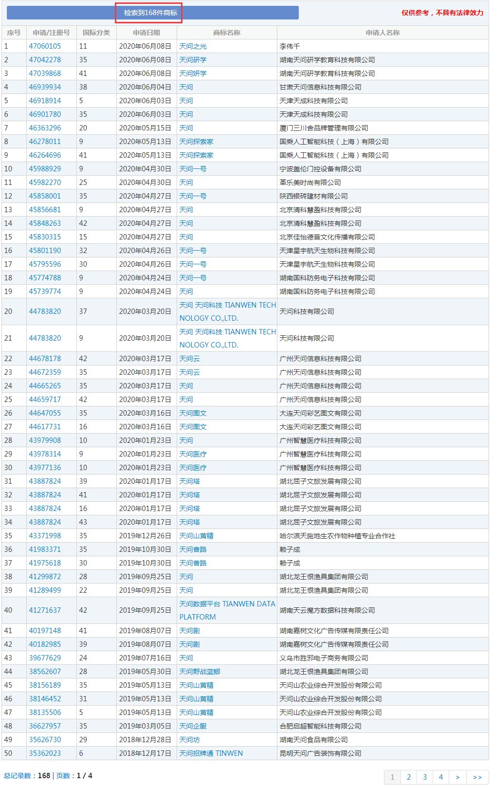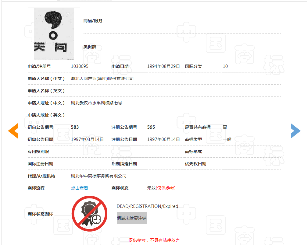 在1994年8月申请了第一件“天问”商标,目前由于期满未续展已经被注销。