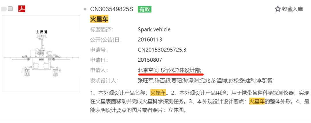 虽然“天问一号”商标遭到抢注,但是“火星车”外观专利早在2015年8月就已经被申请。