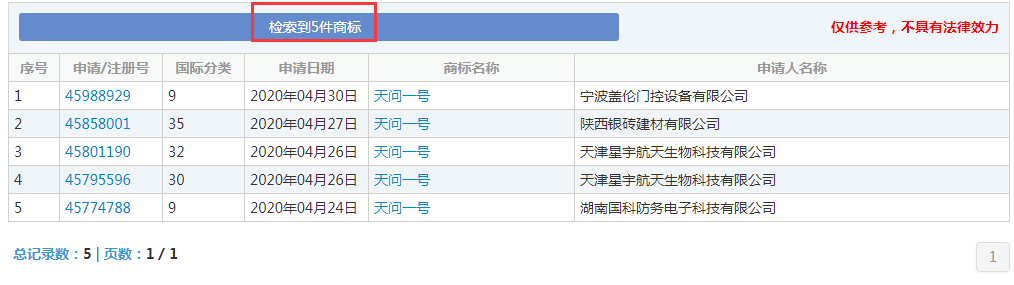 商标网数据显示,截止7月24日,有关“天问一号”的商标申请共5条,申请公司包含湖南国科防务电子科技有限公司、天津星宇航天生物科技有限公司、宁波盖伦门控设备有限公司、陕西银砖建材有限公司,商标状态均为等待实质审查。
