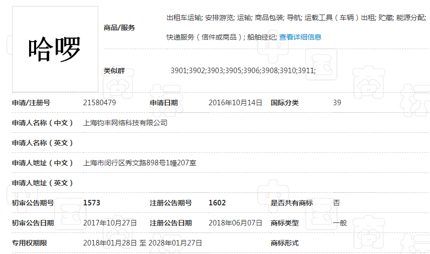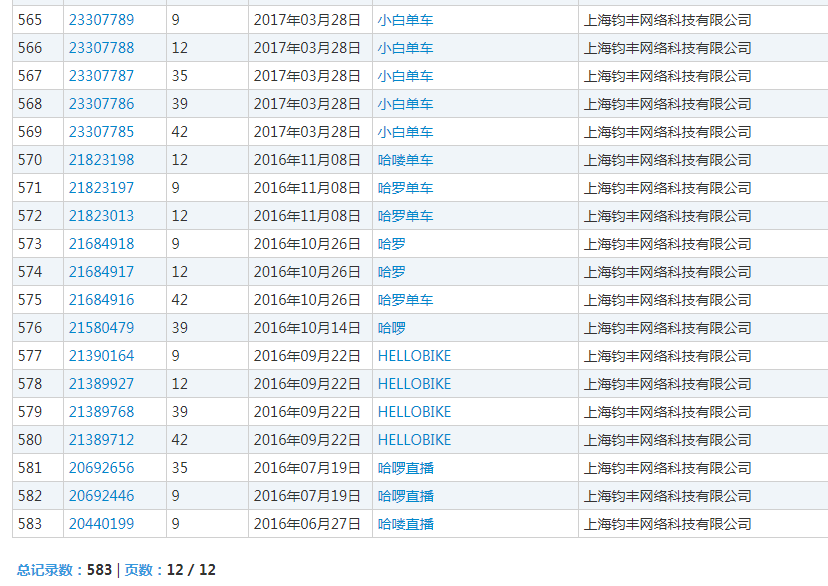 其实,哈啰出行最初并不叫哈啰,同嘀嘀改名“滴滴”类似,由“哈罗单车”变成了现如今的“哈啰出行”。早在2018年9月17日,哈罗单车在上海宣布正式更名为“哈啰出行”。对于更名原因,哈啰出行CEO杨磊称:“啰”字多了一个“口”,寓意着哈啰后期将采取更多措施与公众沟通交流,成为有亲和力的邻家品牌;哈啰出行未来将提供更广泛的出行服务,并开放流量和入口实现行业互惠,构筑多元、融合的智慧出行生态。此次更名真的只是像杨磊介绍的那样简单,还是背后遇到了商标上的隐忧呢?经查询,“哈啰出行”,主要由江苏永安行低碳科技有限公司旗下全资子公司“上海钧丰网络科技有限公司”作为主体申请其商标。在中国商标网查询,钧丰公司自2016年9月至今共有583条商标申请记录,单从数量看商标布局意识是没的说!