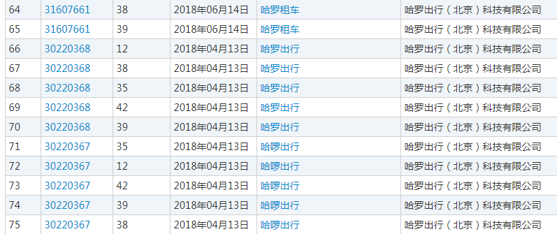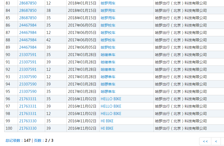 经查北京哈罗从2014年开始到现在总共申请注册了147个商标,其中大部分与“哈罗”、“哈啰”有关。最初申请的多为“哈罗”相关商标,而从2017年3月开始,哈罗出行申请注册了多个带口字旁的“哈啰单车”商标。