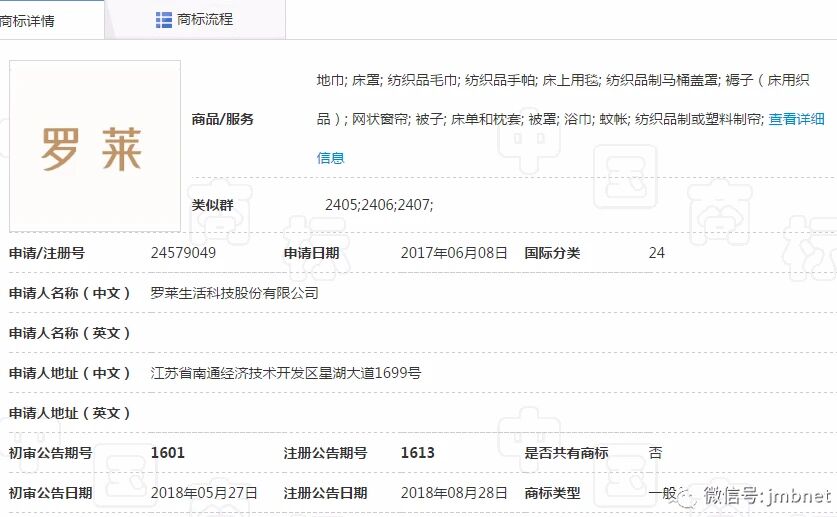 成立于2002年的罗莱生活科技股份有限公司(以下简称“罗莱公司”),在2009年5月经核准注册取得“罗莱家纺”商标,2018年8月,经核准注册取得“罗莱”商标。